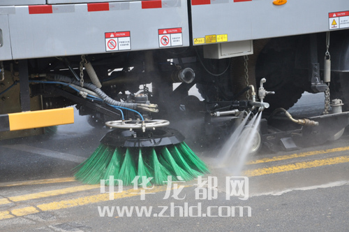 ????當天上午,記者在市政府門前看到,由宇通汽車廠家提供試機的幾臺環(huán)衛(wèi)高壓清洗車和掃地車列成一排(上圖),一臺小型掃地車一邊行駛一邊清掃地面,前端幾個旋轉(zhuǎn)式毛刷(下圖)進行清掃的同時,還向地面噴灑出霧狀水,路面上的各類垃圾清掃后吸入后面的車斗里,駛過之處,路面干凈許多。隨后,大型環(huán)衛(wèi)清洗車“上陣”,車體四周分頂噴、中噴和后噴,四五十米寬的道路都能輕松噴射覆蓋。經(jīng)過清水“洗禮”后,兩旁慢車道上綠化帶的植被上積存的浮土被沖刷得一干二凈,綠意顯得更濃了。打開頂噴,清洗車向天空噴射出幾米高的幾股高壓水柱,有效降塵,凈化空氣。經(jīng)過兩輪試驗下來,記者看到,瀝青馬路上變得干凈而清新,以往灰蒙蒙的馬路一下子變得“眉清目秀”。