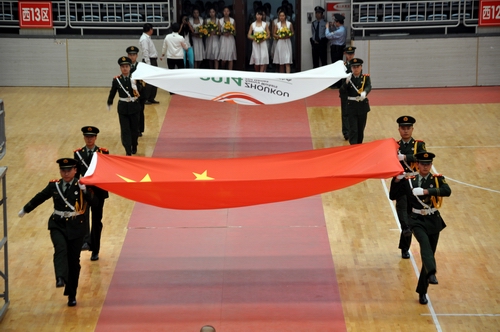 國(guó)旗、會(huì)旗方陣經(jīng)過(guò)主席臺(tái)。