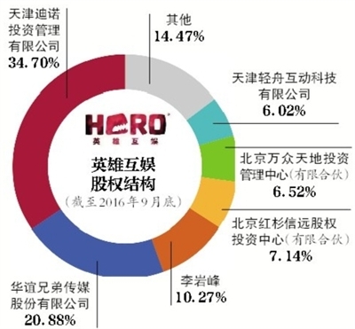 據(jù)英雄互娛三季報,華誼兄弟持有公司2.89億股,占比20.88%,為公司第二大股東。英雄互娛第一大股東為天津迪諾投資管理有限公司,其持有公司34.7%股份。