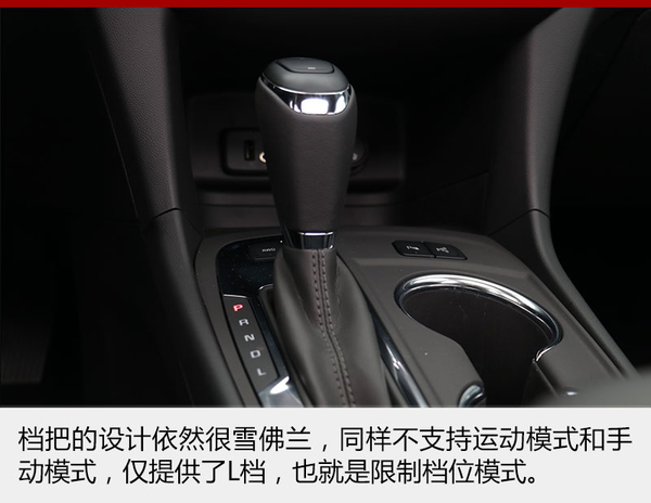 有一點(diǎn)我不是很明白,雪佛蘭最新的設(shè)計(jì)理念已經(jīng)開始向運(yùn)動(dòng)發(fā)展,但是它旗下的車型都不帶有運(yùn)動(dòng)模式和手動(dòng)換擋模式,僅僅是提供了L檔,也就是所謂的限位檔,通過檔把上方的加減按鍵可以手動(dòng)使變速箱限制在相當(dāng)?shù)臋n位上,D檔模式下此按鍵無效。