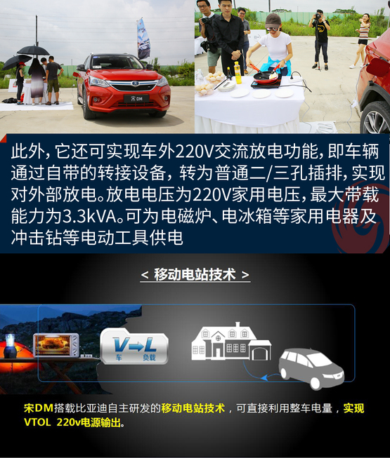 ????????宋DM可實現(xiàn)車外220V交流放電功能(VTOL),即車輛可通過自帶的轉(zhuǎn)接設(shè)備, 轉(zhuǎn)為普通二/三孔插排,實現(xiàn)對外部用電器放電。放電電壓為220V家用電壓,最大帶載能力為3.3kVA,給日常家用電器供電一點沒問題。