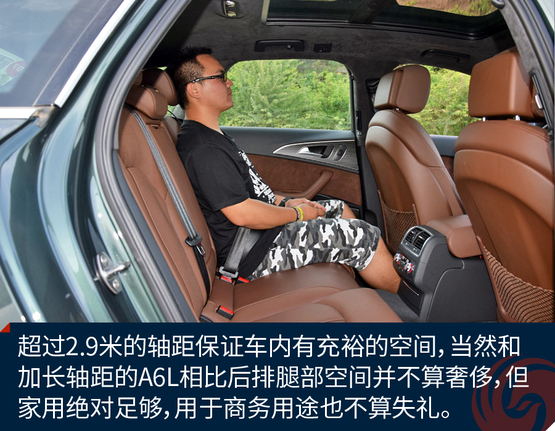 ????????作為中大型豪華車衍生的旅行轎車,A6 Avant提供了充足的乘坐空間,當(dāng)然后排不會(huì)像加長(zhǎng)軸距的A6L那么奢侈,不過(guò)作為商務(wù)接待并不嫌失禮。身高180cm的人在后排足夠舒適,加上旅行車車頂輪廓高挑,后排乘客頭部空間還優(yōu)于三廂轎車。