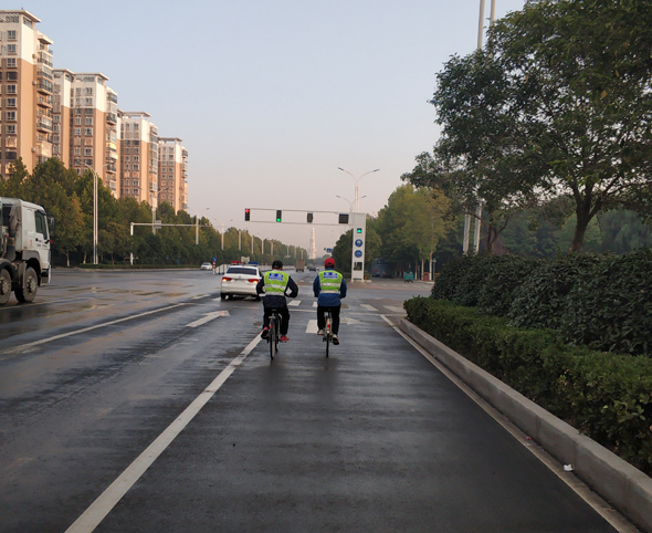 10月3日6時,國際級丈量員、吉林體育學院教授袁林受中國田徑協(xié)會委派,與周口馬拉松組委會工作人員一起,對周馬新調整的賽道進行精準丈量。