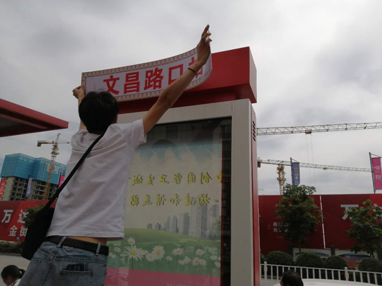 5月20日,在大慶路與文昌大道交叉口北側(cè)路西,市公交總公司安排人員在一些沒有名字的站牌前貼站名,方便市民乘坐公交車,助力我市“創(chuàng)衛(wèi)”工作。 記者 凡留威 攝