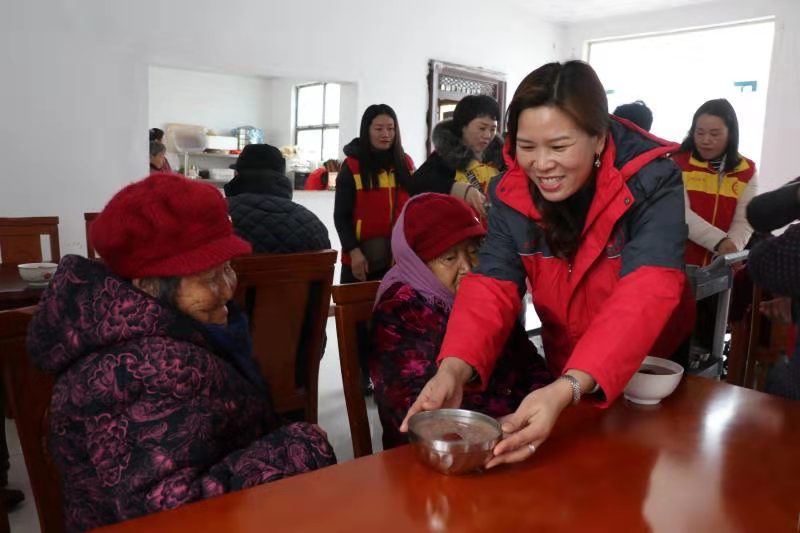 “開飯嘍!”中午時分,志愿者們將老人一一攙扶到餐廳坐下,隨后將一碗碗香氣四溢、且冒著熱氣的八寶粥端到老人跟前。“香,真香!”80歲的黃柏功老人舀了一勺八寶粥放到嘴里品了品笑著說。吃著八寶粥,老人想起了以前的艱苦生活,他禁不住激動地哭了起來:“以前,吃了上頓沒下頓,想吃一塊白面饃,都得等到過年??涩F(xiàn)在,天天不斷肉,生活越來越好。這都是共產(chǎn)黨給咱的福啊?!?/p>