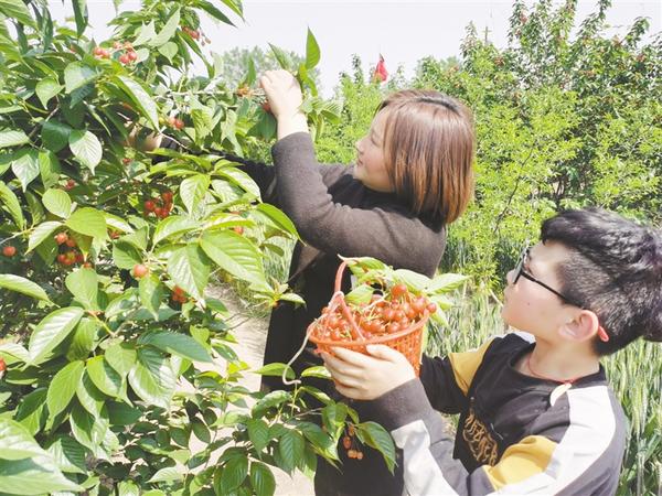 4月26日,在淮陽(yáng)區(qū)豆門(mén)鄉(xiāng)武灣村的櫻桃采摘園內(nèi),人們享受著采摘的樂(lè)趣。武灣村農(nóng)民利用地理優(yōu)勢(shì)種植櫻桃、草莓等,吸引附近的民眾前來(lái)采摘,成為當(dāng)?shù)氐奶厣a(chǎn)業(yè)。記者 孫安平 攝