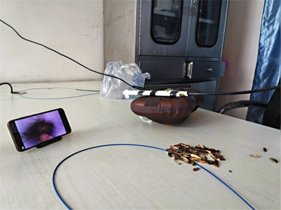 記者看到徐醫(yī)生自制的呼吸內(nèi)鏡,胸部是用一個家用電動按摩枕代替的,用來能模擬人的胸部呼吸起伏;按摩枕上固定了兩個用打印紙卷成的小紙筒,用來代替氣管;屏幕是用手機代替的,用WIFI和氣管鏡鏈接,影像可以通過手機屏幕看到;內(nèi)鏡手柄是徐醫(yī)生用膠泥結(jié)合真實設(shè)備形狀、重量捏制而成的。當(dāng)著記者的面,徐醫(yī)生把一小半瓜子皮放入模擬人體氣管的紙筒,在手機屏幕的導(dǎo)航下通過氣管鏡到達異物所在位置,熟練地用異物鉗夾出異物。