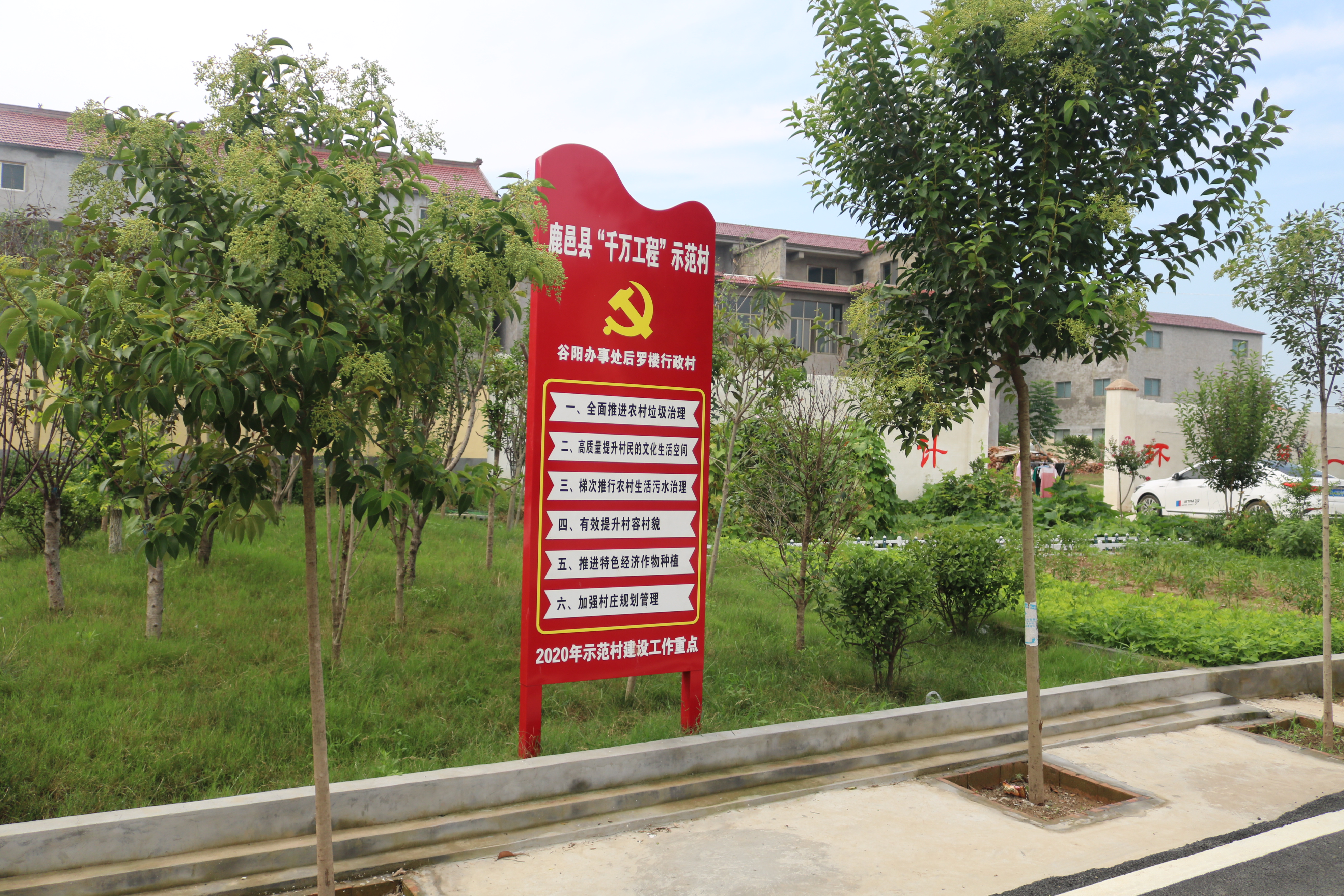 從該縣紫氣大道中段出發(fā),大約10分鐘的車程便抵達了后羅樓村。在該村東入口,一塊標注有“鹿邑縣千萬工程示范村——后羅樓村”的標牌格外引人注目。走進村中,看到的是一棟棟錯落有致的樓院,一條條新修的進村道路標線施劃有序、整潔的村道兩旁點綴著蔥郁的果樹,一幅恬靜悠然、生態(tài)宜居的美麗鄉(xiāng)村景象呈現(xiàn)在眼前。該村村室位于村南頭,在鮮花的果樹的掩映下,幾個保潔工作正在黨群服務中心和群眾文化廣場對面的果園除草,村室內(nèi)工作人員正在為前來辦事的村民辦理公務。