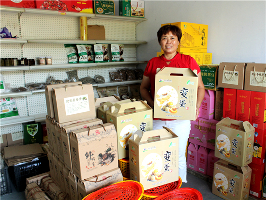 幾年前,孔粉蓮曾干過建材生意,賣過油漆、涂料等,但最讓她得心應(yīng)手的還是經(jīng)營當(dāng)?shù)氐霓r(nóng)特產(chǎn)品。她在村里開了一家小門店,代銷當(dāng)?shù)氐暮睖?、石磨面、食用菌、紅薯粉條等,顧客贏門,生意很是紅火。
