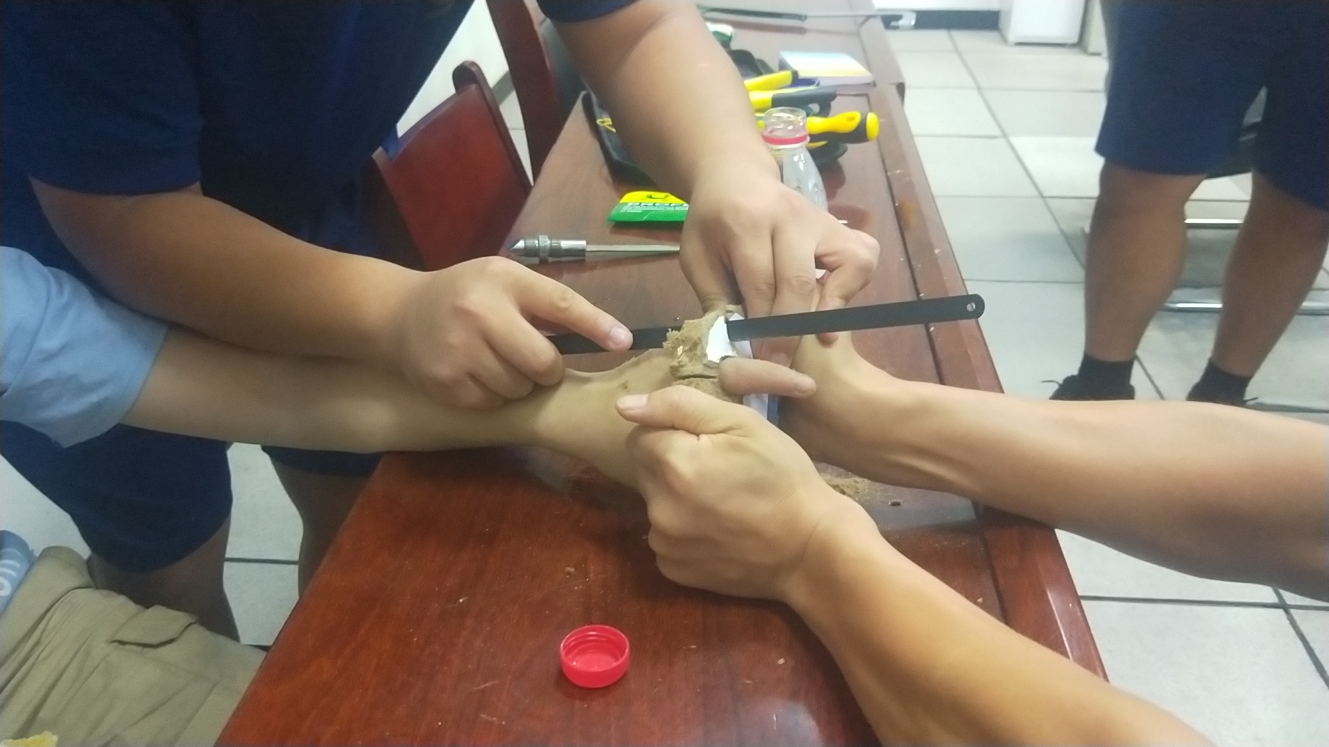 看到救援人員,小男孩十分害羞,有點(diǎn)不好意思?!拔铱醋雷由嫌袀€孔,就是想看看手指能不能伸進(jìn)去,結(jié)果就拔不出來了?!本仍藛T經(jīng)觀察發(fā)現(xiàn),小男孩左手無名指被卡在課桌木板上的小孔里,木板已被裁下,木板材質(zhì)為鋸末壓縮板,此時小男孩手指被卡部位周圍已發(fā)生腫脹必須馬上處理。救援人員利用鋼鋸將木板一點(diǎn)點(diǎn)鋸開,然后又用鉗子用力將木板夾開,經(jīng)過3分鐘救援,成功將禁錮小男孩手指的木板摘除??吹侥景灞粡氖稚先∠?,男孩長長地舒了口氣。