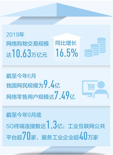 截至2020年6月,我國網(wǎng)民規(guī)模為9.4億,網(wǎng)絡(luò)零售用戶規(guī)模達7.49億。2019年網(wǎng)絡(luò)購物交易規(guī)模達10.63萬億元,同比增長16.5%。截至今年9月底,5G終端連接數(shù)達到1.3億;制造業(yè)數(shù)字化轉(zhuǎn)型穩(wěn)步前進,工業(yè)互聯(lián)網(wǎng)公共平臺超過70家,服務(wù)的工業(yè)企業(yè)超過40萬家……如今,數(shù)字經(jīng)濟蓬勃發(fā)展,成為經(jīng)濟發(fā)展的新增長點,產(chǎn)業(yè)數(shù)字化與數(shù)字產(chǎn)業(yè)化的基礎(chǔ)更加堅實,不斷為高質(zhì)量發(fā)展注入新動能。