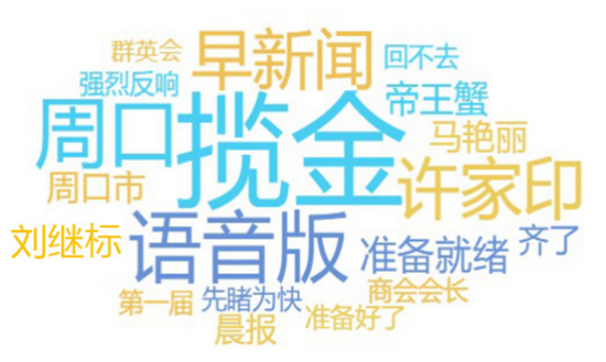 網(wǎng)絡(luò)熱詞反映了網(wǎng)民關(guān)注的重點(diǎn),詞云圖中大大的“攬金”二字占據(jù)詞云圖中央,可見攬金是真的攬金,據(jù)悉,首屆周商大會(huì)簽約項(xiàng)目31個(gè),總投資達(dá)429.7億元人民幣?!霸S家印”“馬艷麗”在整個(gè)圖中也是光彩奪目,作為周口人,走上北上廣深的成功人士還心心念念家鄉(xiāng)的發(fā)展,讓老鄉(xiāng)們倍感溫暖,家鄉(xiāng)人關(guān)注他們?yōu)榧亦l(xiāng)發(fā)展做出的努力和他們的動(dòng)態(tài)也是再正常不過了。