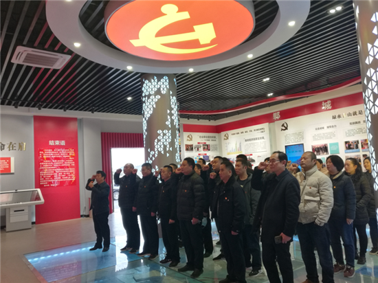 在宣誓臺前,全體黨員干部面對鮮紅的黨旗,高舉右手莊嚴(yán)宣誓,重溫入黨誓詞。