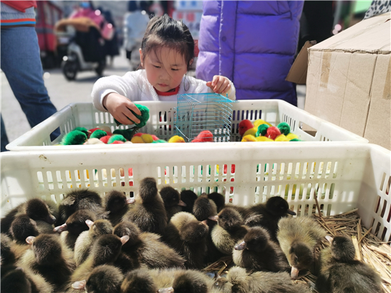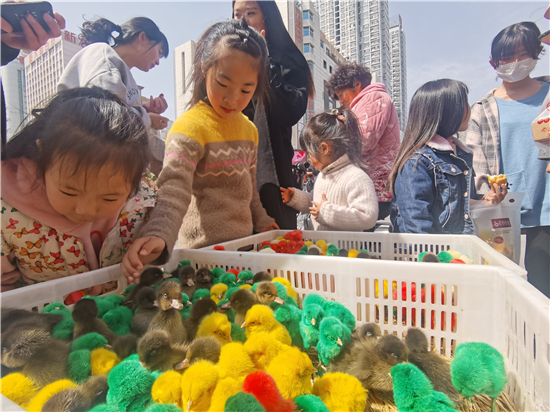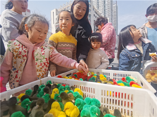 3月21日,在城區(qū)五一路口,幾個售賣小雞小鴨的攤位前吸引了不少市民。所售賣的小雞小鴨被染上了紅色、黃色、綠色等色彩艷麗的顏色,憨態(tài)可掬的小雞小鴨尤其受到了孩子們的喜愛,不時有過往行人駐足詢問價格。