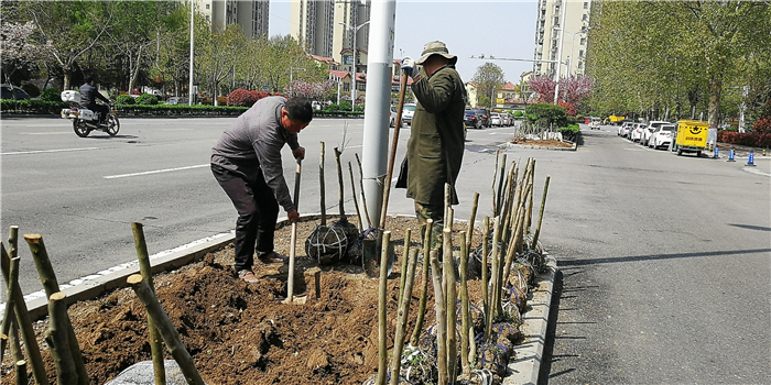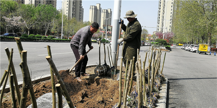 仲春時節(jié),我市積極打造街頭游園、口袋公園,增加市民休閑游樂場所。圖為園林工人正在施工。②7