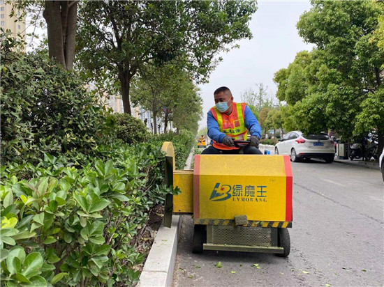 4月13日,周口大道上園林工人操作著特殊的園林作業(yè)車,修剪路邊的綠化樹,使用“電推子”,不僅提高了效率、節(jié)省了人力,就連“剃”出來的“平頭”也更平了?!半娡谱印彼街?,綠化樹被修剪得很齊整。②9