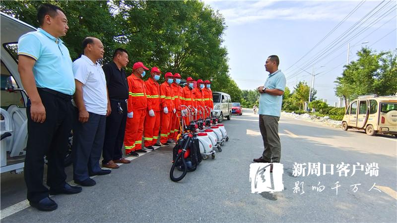 “老關,你們?nèi)膫€人去女媧景區(qū)消殺。老王,老溫你們兩個人去村莊消殺,尤其是旮旯處、垃圾堆、屋后等隱蔽重點區(qū)域一定消殺徹底,不留空白。在村莊內(nèi)進行消殺時,一定要和群眾交代好防疫消毒時的注意事項?!?月30日9時許,來自廣州市鴻鷹害蟲防治服務有限公司周口分公司的10多名愛心人士載著4臺機動手推式滯留噴霧機、1臺電動背負式超低容量噴霧機、1臺大型車載式超低容量噴霧機和230公斤消毒劑,來到西華聶堆鎮(zhèn)思都崗村后,該公司負責人許金山就向工作人員一一分配消殺任務。
