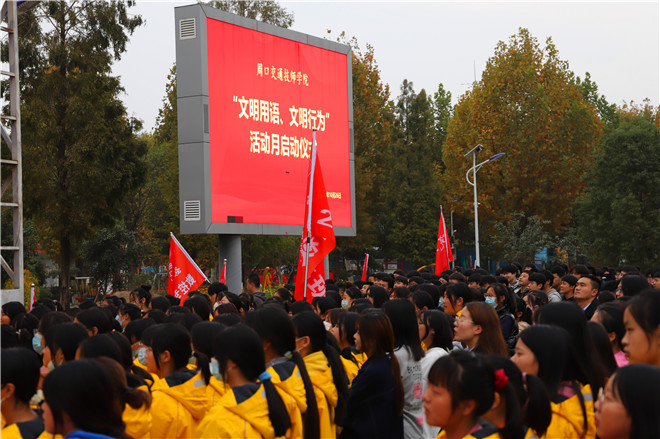 “我是周口交通技師學(xué)院的一名學(xué)生,從今天起,我要講禮儀、懂禮貌、不說(shuō)臟話(huà)……積極參加“文明用語(yǔ)、文明行為”主題實(shí)踐活動(dòng),爭(zhēng)做文明學(xué)生?!?0月26日,周口交通技師學(xué)院全體師生在學(xué)院“文明用語(yǔ)、文明行為”活動(dòng)月動(dòng)員會(huì)上集體宣誓。師生們堅(jiān)定的目光和錚錚的誓言,展現(xiàn)出青年學(xué)子講文明話(huà)、辦文明事、做文明人的堅(jiān)定決心。