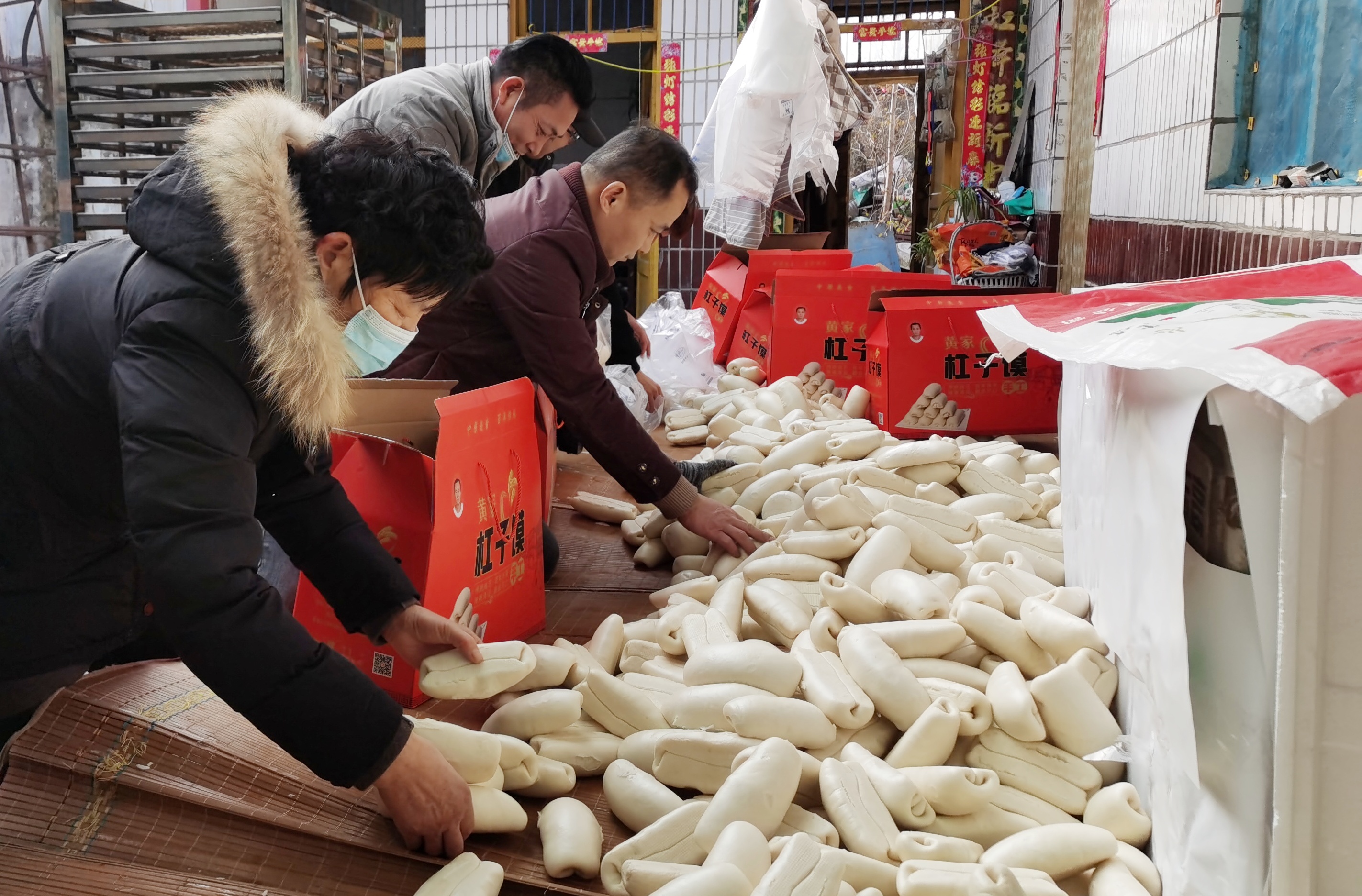小伙子姓黃,20歲,他的父親不能說話,是殘疾人。趕到過年,店里非常忙碌,全家上陣制作杠子饃,小黃放假了就來店里幫忙。隨著時代發(fā)展,現(xiàn)在和面、分面劑都有機器,蒸饃也有蒸箱,一次能出1000多個,少了煙熏火燎,進入智能化、高效化的軌道。但杠子饃由于形狀特殊,加之過年期間需求量特別大,所以“做年饃”仍是辛苦活兒,需在頭天晚上將面摻上酵子(方言,即含有酵母的面團,也叫引酵)和好,放在溫暖處任其發(fā)酵。趕上年關這樣的旺季,往往需要幾十個人通宵達旦地加工,搟劑子、卷造型、二次發(fā)酵,徹夜不息。杠子饃干后不開裂,耐貯存,能放置一個月以上不變質(zhì),這是傳統(tǒng)工藝與現(xiàn)代技術相結合的成果?!爸芸谌诉^年哪兒有不備饃的?你們看我這邊十來個箱子,每個箱子要裝50多個饃,都是要裝好寄到外地的,北京、上海的都有?!毙↑S說。