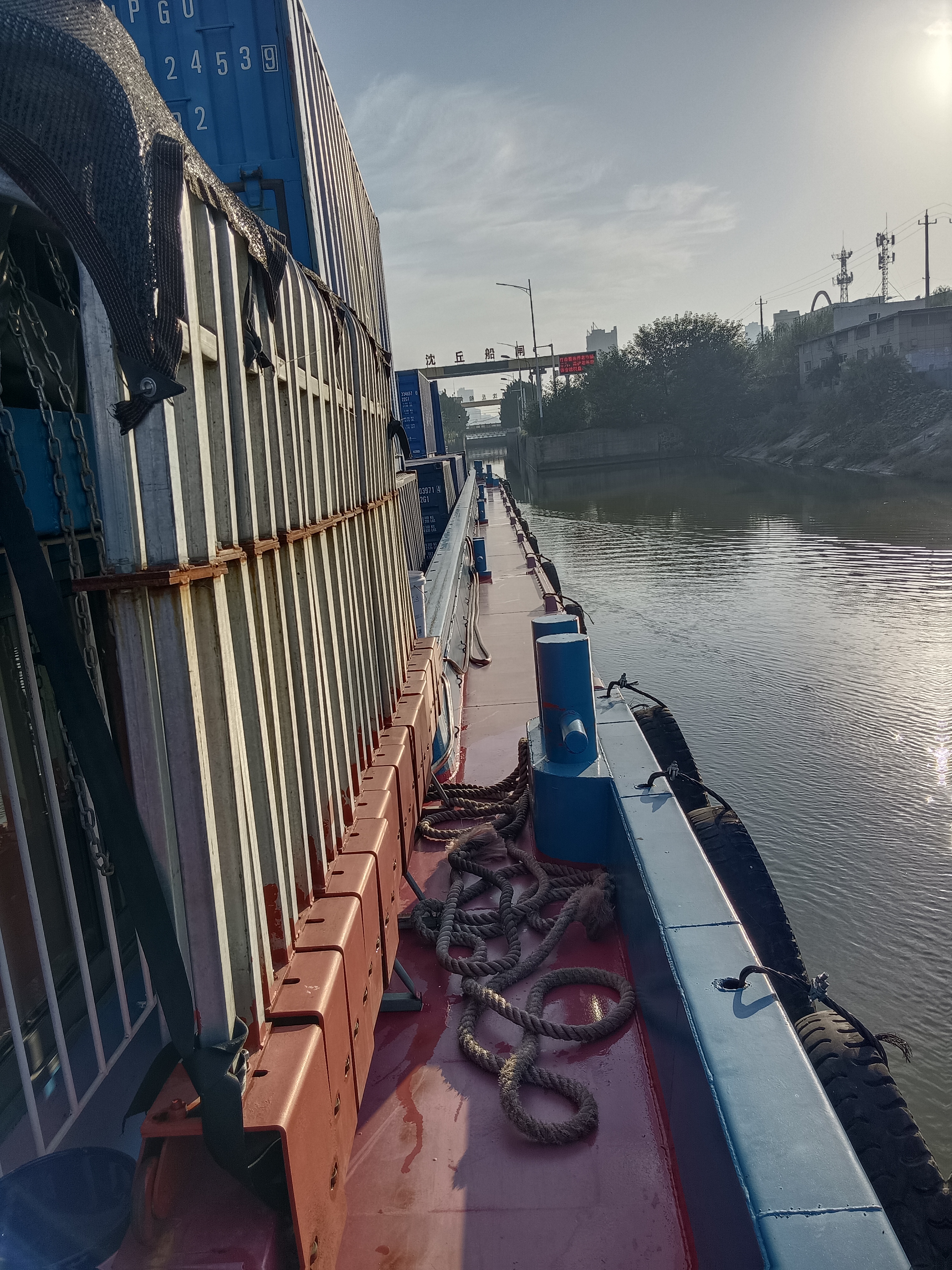 9月25日傍晚,“船老大”董海軍吊裝好了36個集裝箱,從項城港啟航了。他運送的貨物是純堿,生產(chǎn)玻璃的原材料,目的地是安徽鳳陽港。這次,記者一行從水路出發(fā),隨行采訪。