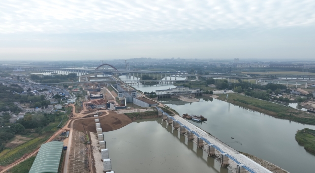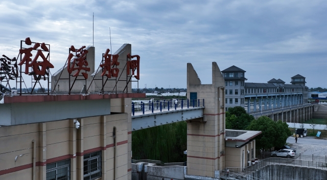 9月24日,豫貨出海、“周”向世界——周口航運出海大型異地采訪活動采訪組B組沿江淮運河南下,一路上攬渡槽、臨派河、經(jīng)巢湖閘,再沿裕溪河左岸大堤下行,經(jīng)過一道河灣后,一座高大的建筑如臥龍一般橫跨裕溪河上。