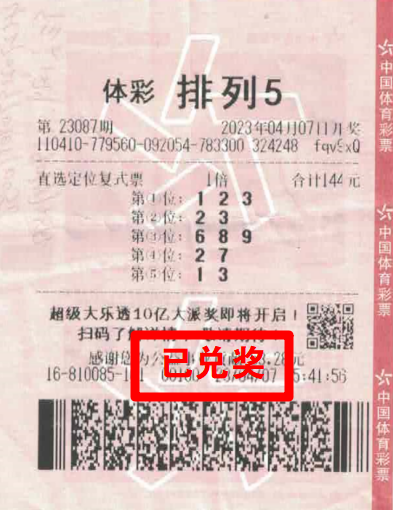 中獎當天,購彩者和往常一樣來到店里,對著店內的歷史開獎號碼研究了一會兒,果斷選擇了定位復式進行投注。據(jù)悉,中獎者張先生(化名)多年來養(yǎng)成購買體育彩票小盤玩法排列型游戲的習慣,積累了豐富的購彩經驗,對該玩法有自己獨到的分析方法和見解,善于利用定位復式進行購買,購彩多年,體育彩票排列型玩法給他帶來了多次中獎驚喜和美好的購彩體驗。23087期,在經過自己的仔細分析和判斷后,張先生第一位選定123,第二位選定23,第三位選定689,第四位選定27,第五位選定13,組合成為一張144元的排列5定位復式票,巧妙運用自己獨特的選號技巧,幸運命中當期排列5一等獎。