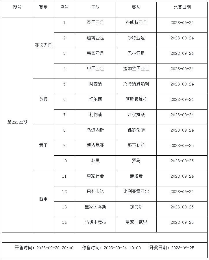 足球彩票勝負(fù)游戲(14場和任選9場)第23122期賽程: