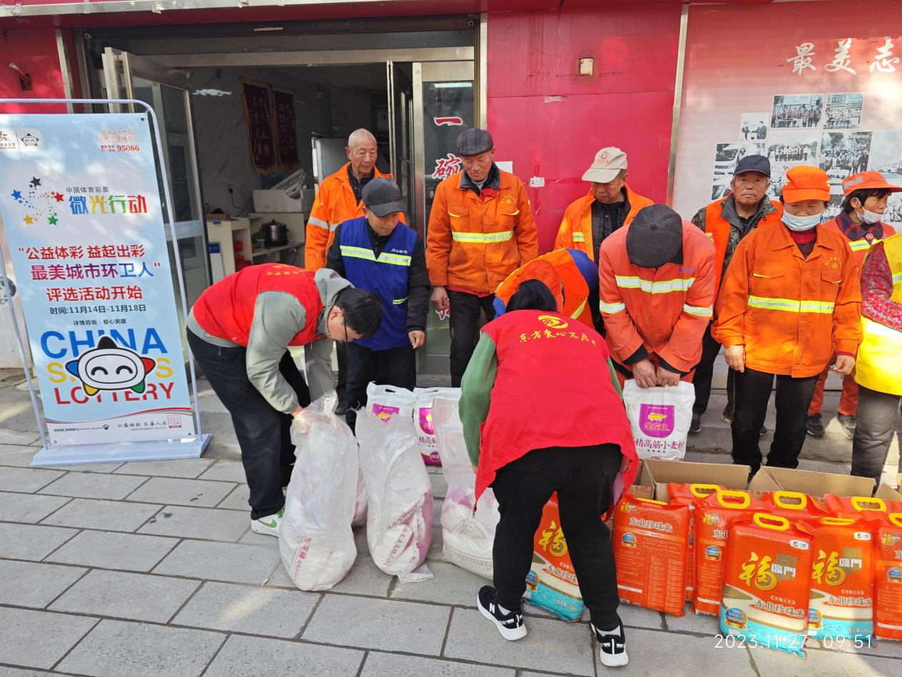 11月27日,周口體彩分中心工作人員攜帶米、面等物資來(lái)到“東方愛(ài)心粥屋”開(kāi)展“公益體彩 益起出彩”致敬“城市最美環(huán)衛(wèi)人”活動(dòng)公益活動(dòng),對(duì)20名“城市最美環(huán)衛(wèi)人”開(kāi)展捐助。