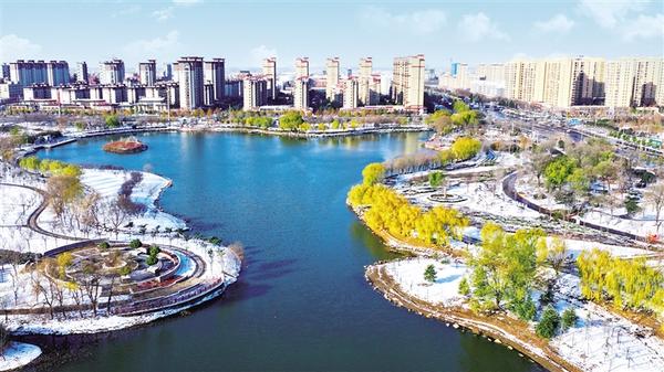 12月13日,扶溝縣人民公園白雪皚皚、天藍(lán)水清、柳樹正黃,與遠(yuǎn)處聳立的高樓,共同構(gòu)成一幅絕美畫卷,成為市民休閑散步的好去處。