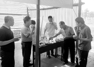 6:30:王隆集行政村黨支部書(shū)記趙長(zhǎng)領(lǐng)、包村干部王海強(qiáng)召集其他四位行政村干部在設(shè)在村頭的“三夏”防火指揮部開(kāi)會(huì)。