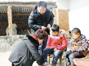 張智博的愛人正在為孩子穿新鞋。圖為今年春節(jié)前夕,張智博與愛人一起到駐馬店市泌陽縣看望孩子,并為他們送去慰問品和慰問金。(資料圖片)
