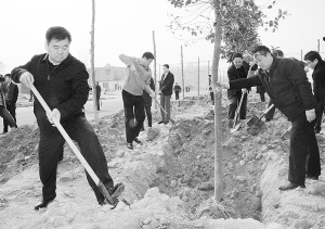 市委書記徐光等領(lǐng)導仔細培土。記者 王映 攝