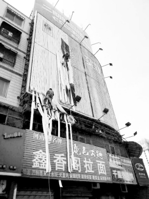 4月9日上午,在周口市區(qū)七一路與大慶路交叉口,兩名工人忙著整修廣告牌,他們“攀附”在墻上的身影,如同電影里的“蜘蛛俠”,讓過往市民無不敬畏勞動(dòng)者的辛勞與偉大。晚報(bào)記者  張志新  攝